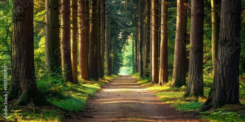 Obraz premium A quiet forest path lined with tall trees and dappled sunlight, leading to a...