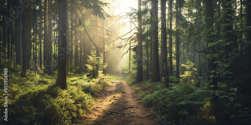 Obraz premium A quiet forest path with sunlight filtering through the trees
