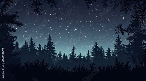 Fototapeta premium A quiet forest with dark trees silhouetted against a starry night sky.