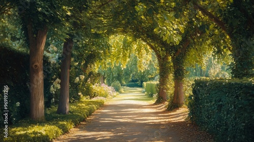 Naklejka premium A quiet garden path with a canopy of trees, casting dappled sunlight on the...