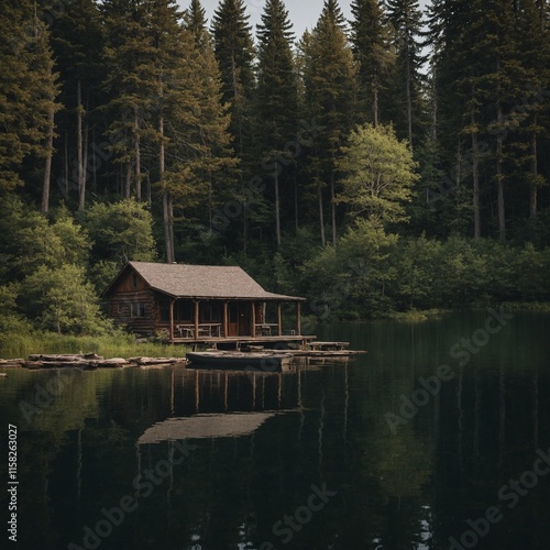 © Ejaz, Fototapeta premium A quiet lakeside cabin surrounded by trees.