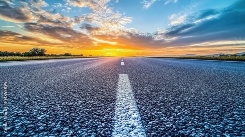 © 69, Naklejka premium A quiet, large asphalt road illuminated by the fading light of the day, with a breathtaking sunset and swirling clouds above