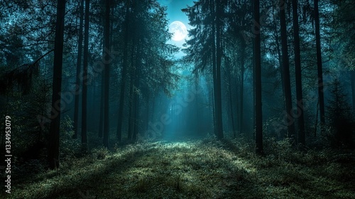 © amir, Obraz premium A quiet, moonlit night in a dense forest, with shadows cast by towering trees.