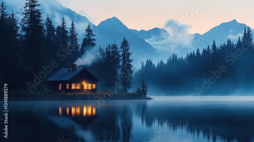 © MochSjamsul, Fototapeta premium A quiet mountain cabin with smoke rising from the chimney, symbolizing calm and introspective thoughts