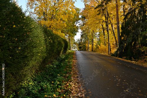 © Mikhail Olykainen, Fototapeta premium a quiet road lined with dense, green hedges on one side and tall trees with golden yellow leaves on the other
