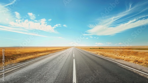 © KOSHKAROV SERGEI, Fototapeta premium A Quiet Road Stretching Towards the Horizon Under a Blue Sky