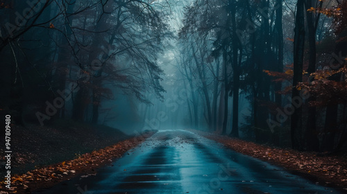 Fototapeta premium A quiet road through a dense forest, illuminated by soft mist, with scattered autumn leaves alongside the wet pavement.