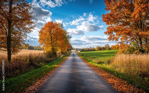 © Marina, Fototapeta premium A quiet rural road with vibrant autumn foliage lining the way, under a blue sky filled with soft clouds