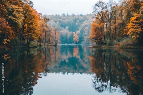 © tayyaba, Fototapeta premium A quiet, secluded lake with a mirror-like surface, reflecting the trees in full autumn colors