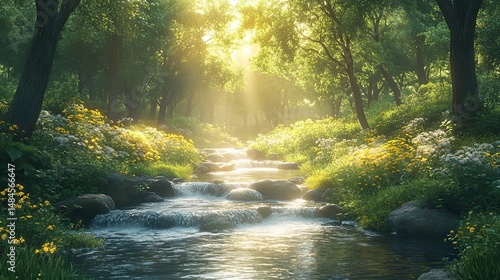 Obraz premium A quiet stream meanders through a lush green valley, its gentle murmur...