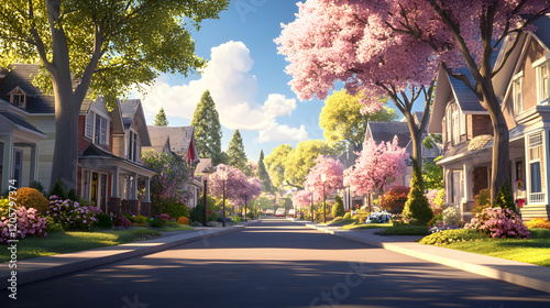 Naklejka premium A quiet suburban neighborhood with tree-lined streets and charming houses