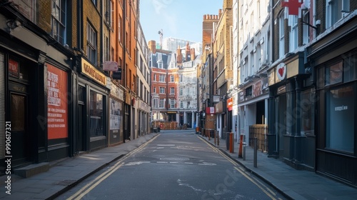© Iswanto, Fototapeta premium A quiet urban street scene featuring buildings and shops under a clear blue sky.
