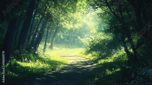 Obraz premium A quiet, winding path through a lush green forest, dappled sunlight streaming...