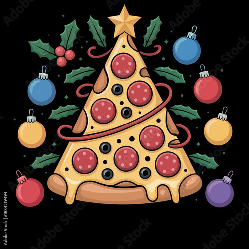 Naklejka premium A quirky design featuring a pizza slice arranged as a Christmas tree. It is adorned with festive ornaments and holly leaves.
