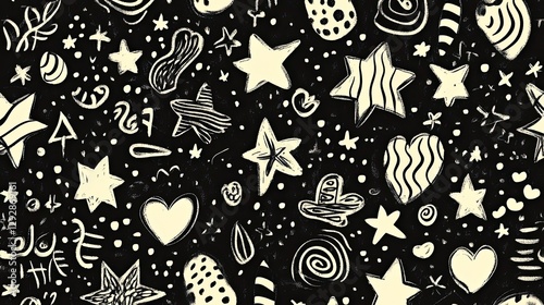 Fototapeta premium A quirky hand-drawn doodle pattern featuring stars, hearts, and abstract shapes in monochrome.