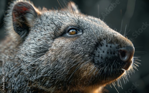Fototapeta premium A quokka with brown eyes looks up in close up
