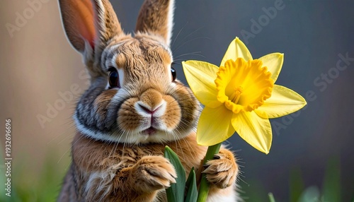 Fototapeta premium A rabbit holding a lily or daffodil.