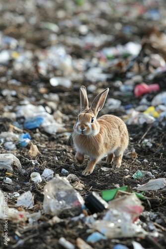 © Vagner Castro, Fototapeta premium A rabbit running through a garbage dump looking for food. Scared rabbit in an outdoor garbage dump.