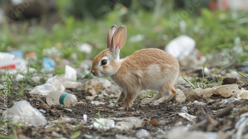 Fototapeta premium A rabbit running through a garbage dump looking for food. Scared rabbit in an...