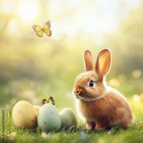 © Nikolai, Fototapeta premium A rabbit sits in grass surrounded by colorful eggs and a butterfly, celebrating Easter joy.