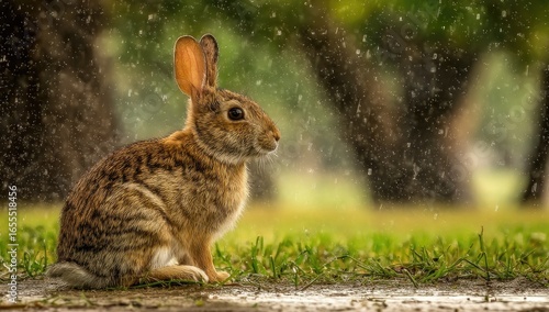 Fototapeta premium A rabbit sits in the grass during a light rain shower.