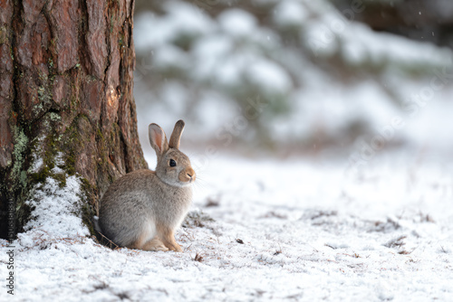 Fototapeta premium a rabbit sitting in the snow next to a tree