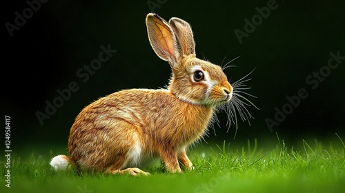 © Olga, Fototapeta premium A rabbit sitting on green grass against a dark background