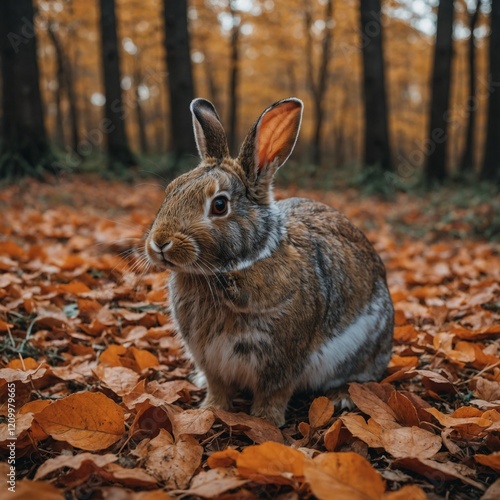 © Ejaz, Fototapeta premium A rabbit surrounded by orange and red leaves in an autumn forest.