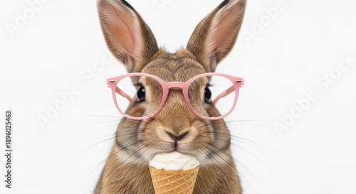 © Nazma, Obraz premium A rabbit wearing pink glasses and eating an ice cream cone
