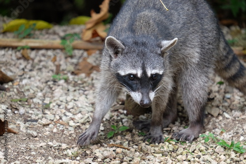 Obraz premium A raccoon came out of the jungle in Costa Rica and sits on the gravel of the driveway
