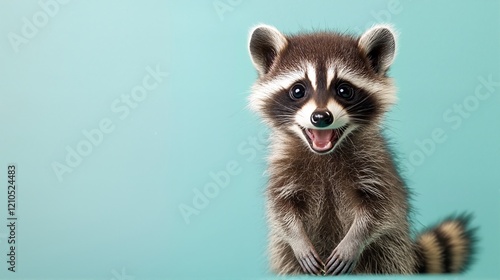 © KarpenArt Studio, Fototapeta premium A raccoon cub with its mouth open and standing on its hind legs.
