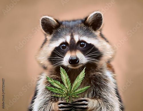© fotoluigi868, Fototapeta premium A raccoon holding a cannabis plant with a curious expression, set against a beige backgroun_1(232)