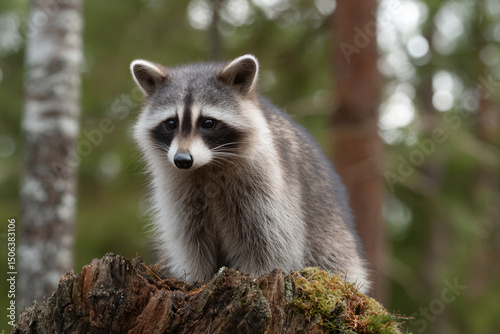 © mizmizstk, Fototapeta premium a raccoon standing on a tree stump in the woods