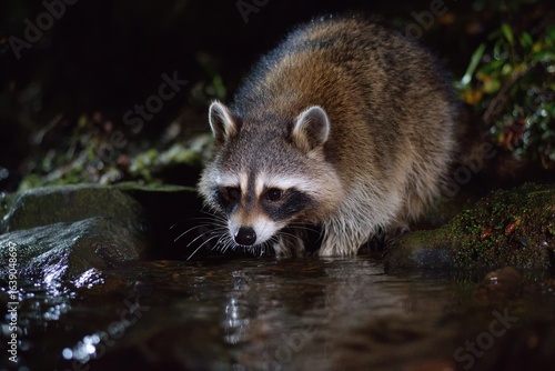 © Phatsawut, Fototapeta premium A Raccoons Culinary Cleansing Observing a Wildlife Masterclass in a Nighttime Stream