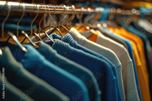 © Fotograf, Fototapeta premium A rack of clothes hanging on a clothes rack. Suitable for fashion and retail-related projects