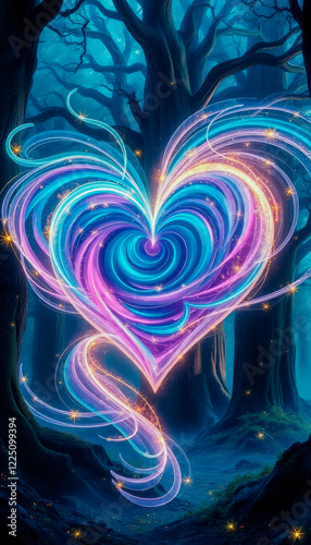 Obraz premium A radiant blue and purple heart made of swirling magical energy floats in a mystical forest, symbolizing love and romance on Valentine's Day.
