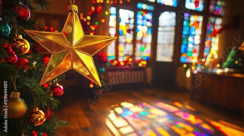 © Aqsa, Naklejka premium A radiant golden Christmas star ornament hanging in a stained glass window, casting colorful patterns of light across a room filled with festive decorations.