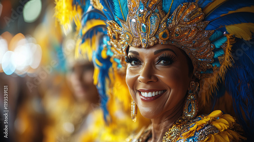 © alexandra_pp, Fototapeta premium A radiant samba dancer in an elaborate blue and gold feathered headdress and shimmering costume smiles joyfully, surrounded by dazzling festival lights and the energetic rhythm of the carnival parade.
