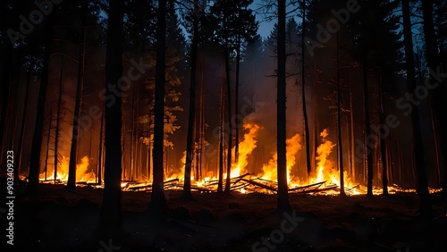 Obraz premium A raging fire burning in a dark forest at night, casting a warm glow on the...