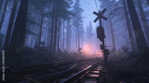 Naklejka premium A railroad track in the middle of a dense forest, with a signal light and crossing sign in the foreground. The forest is shrouded in mist, giving it an eerie and mysterious atmosphere.