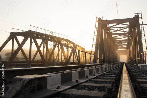 Obraz premium A railway bridge in the morning fog or smoke through which the rays of the...