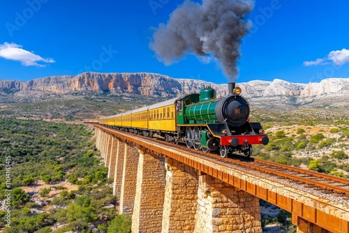 © Thanyarat, Obraz premium A railway bridge spanning a rocky gorge, with a train passing over it and smoke billowing into the blue sky