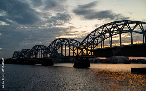 © INGA, Naklejka premium A railway bridge spanning over a river at sunset, with warm golden light reflecting on the water.