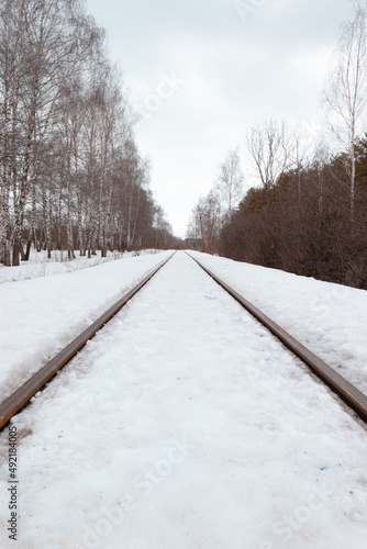 Naklejka premium A railway going to the perspective with trees - pines and birches are on the side. During a snowy winter or spring