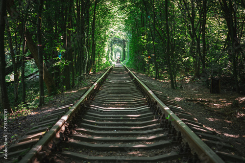 © Ruslan Ivantsov, Obraz premium a railway in the spring forest tunnel of love