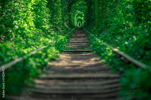 © Ruslan Ivantsov, Obraz premium a railway in the spring forest tunnel of love