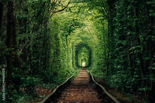 © Ruslan Ivantsov, Obraz premium a railway in the spring forest tunnel of love