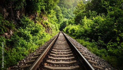 Fototapeta premium A railway track winds through a lush green forest, disappearing into the...