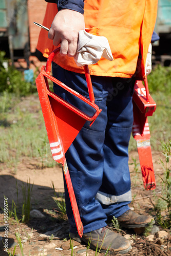 Fototapeta premium a railway worker in an orange signal vest and arms holds in his hand a red brake shoe