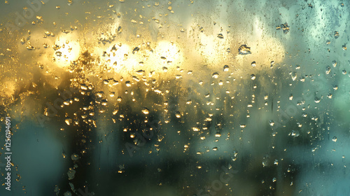 © afrah, Obraz premium A rain-covered windowpane with soft light reflections creating a peaceful atmosphere